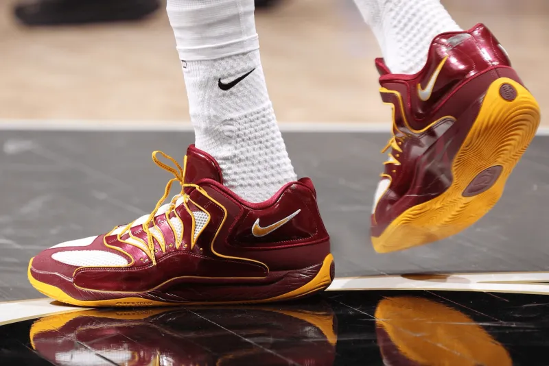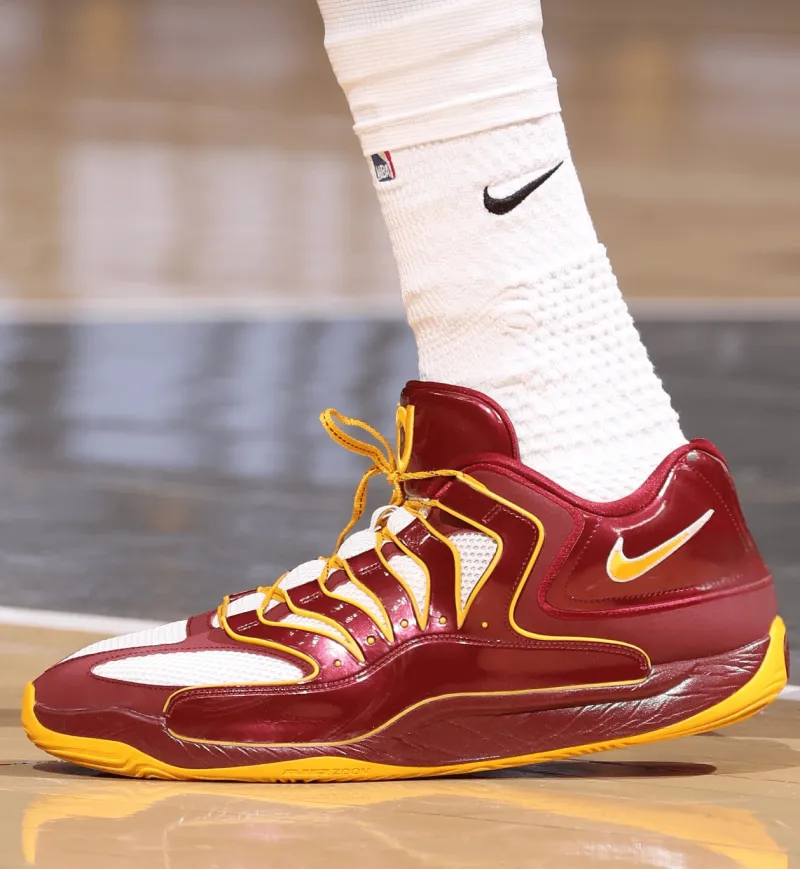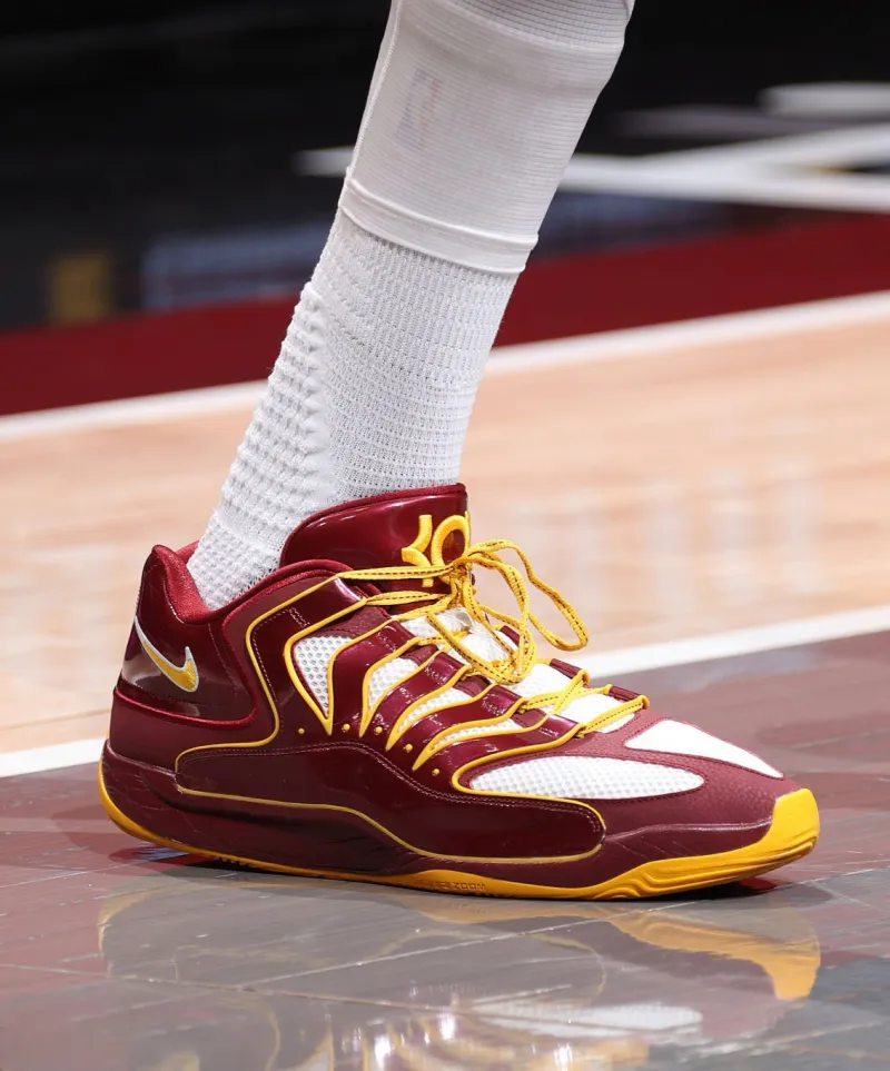 比赛中,杜兰特上脚华盛顿指挥官配色Nike KD18“Washington Commanders”PE,配色灵感来自杜兰特家乡球队NFL指挥官队的队服颜色。